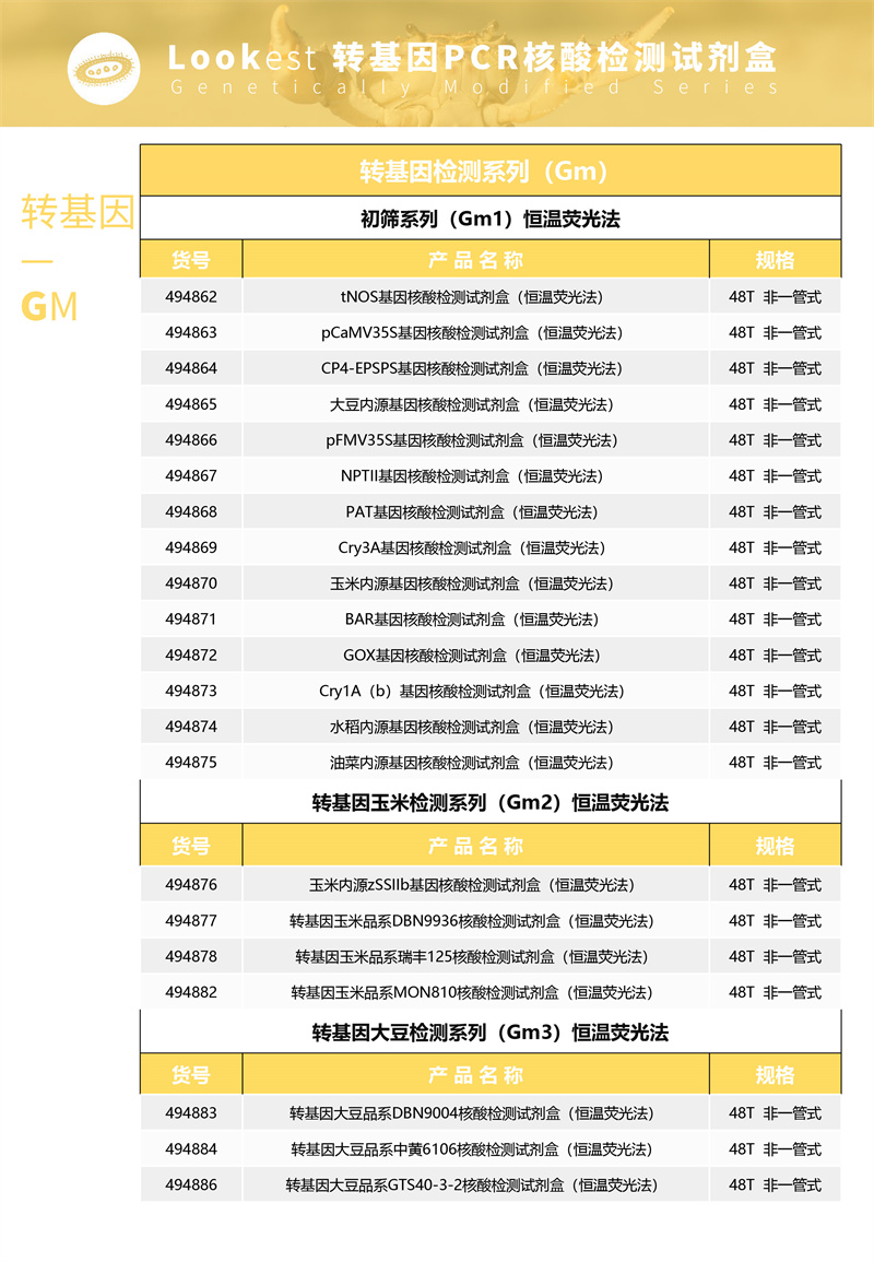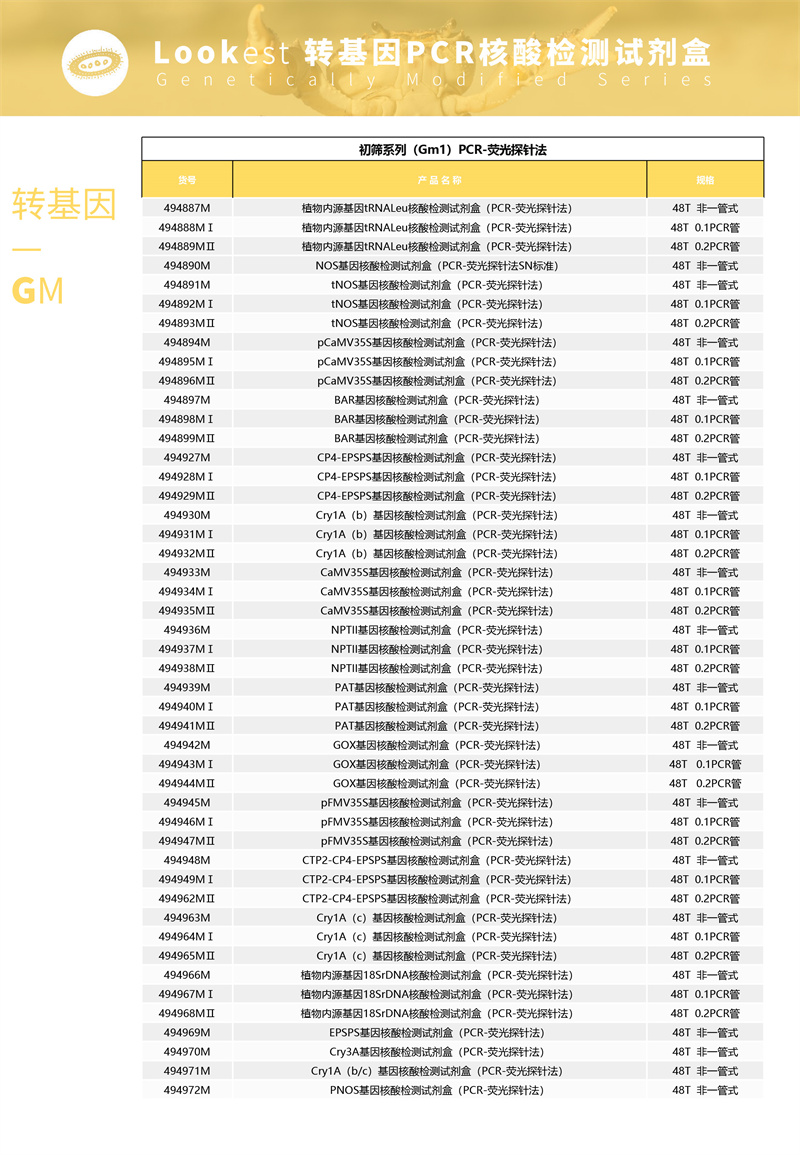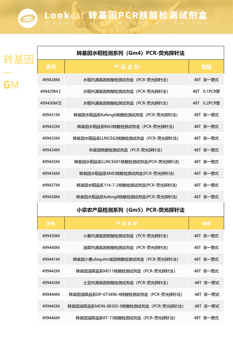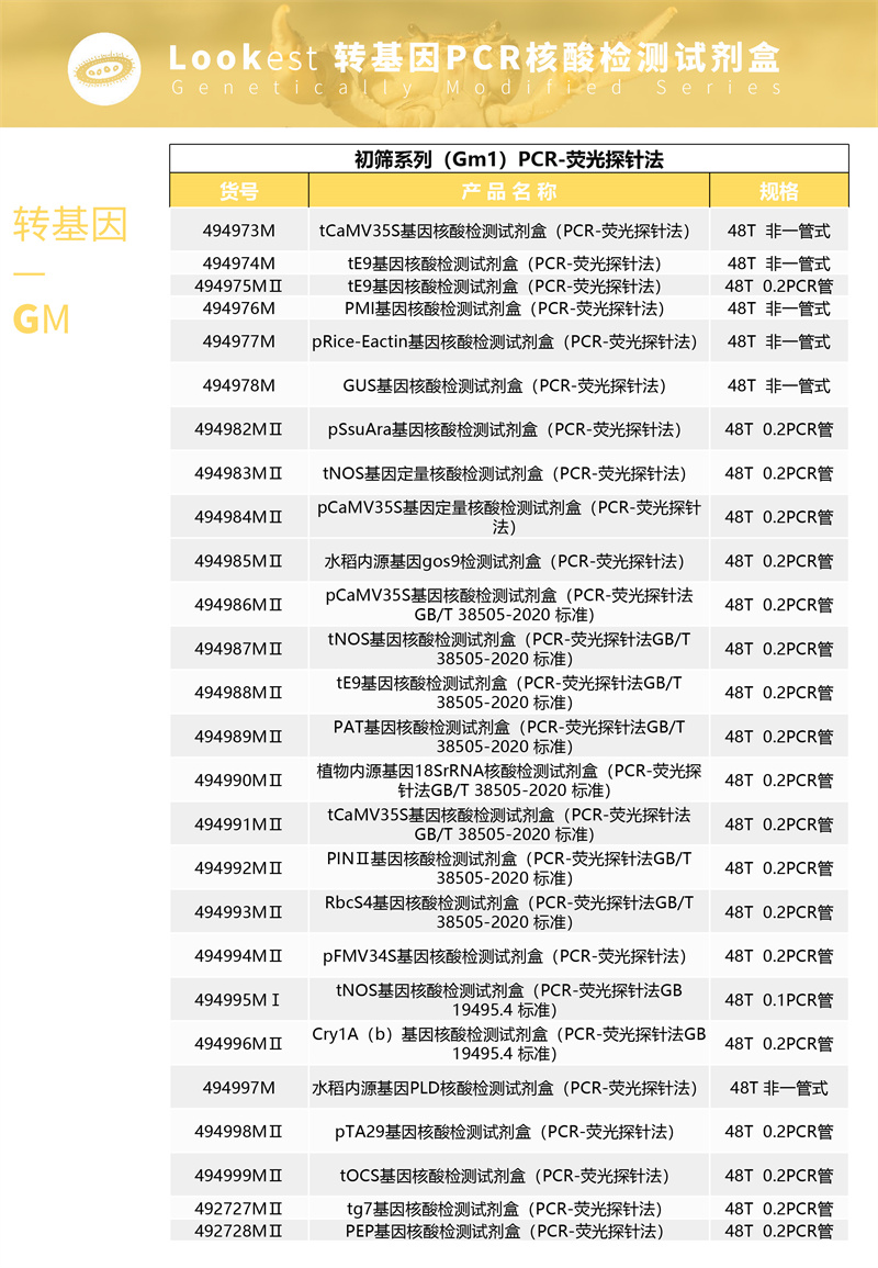 Lookest   转基因检测系列产品可针对食品、饲料等样品中转基因成分的特异核酸片段进行扩增,通过实时扩增曲线判定结果。本产品用于转基因油菜品系 MS11 成分的检测,检出限为 0.01%